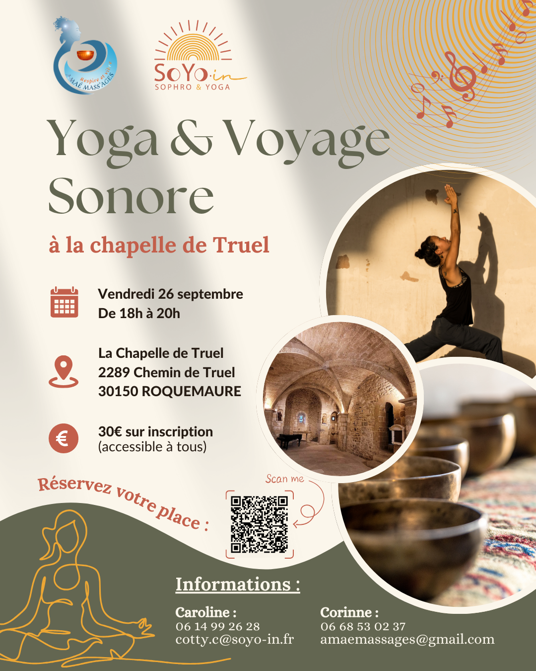 Pour finir septembre en toute sérénité, nous vous proposons avec Corinne, massothérapeute et sonothérapeute, une pause hors du temps dans un lieu chargé d’histoire et de résonances : la Chapelle de Truel, à Roquemaure.