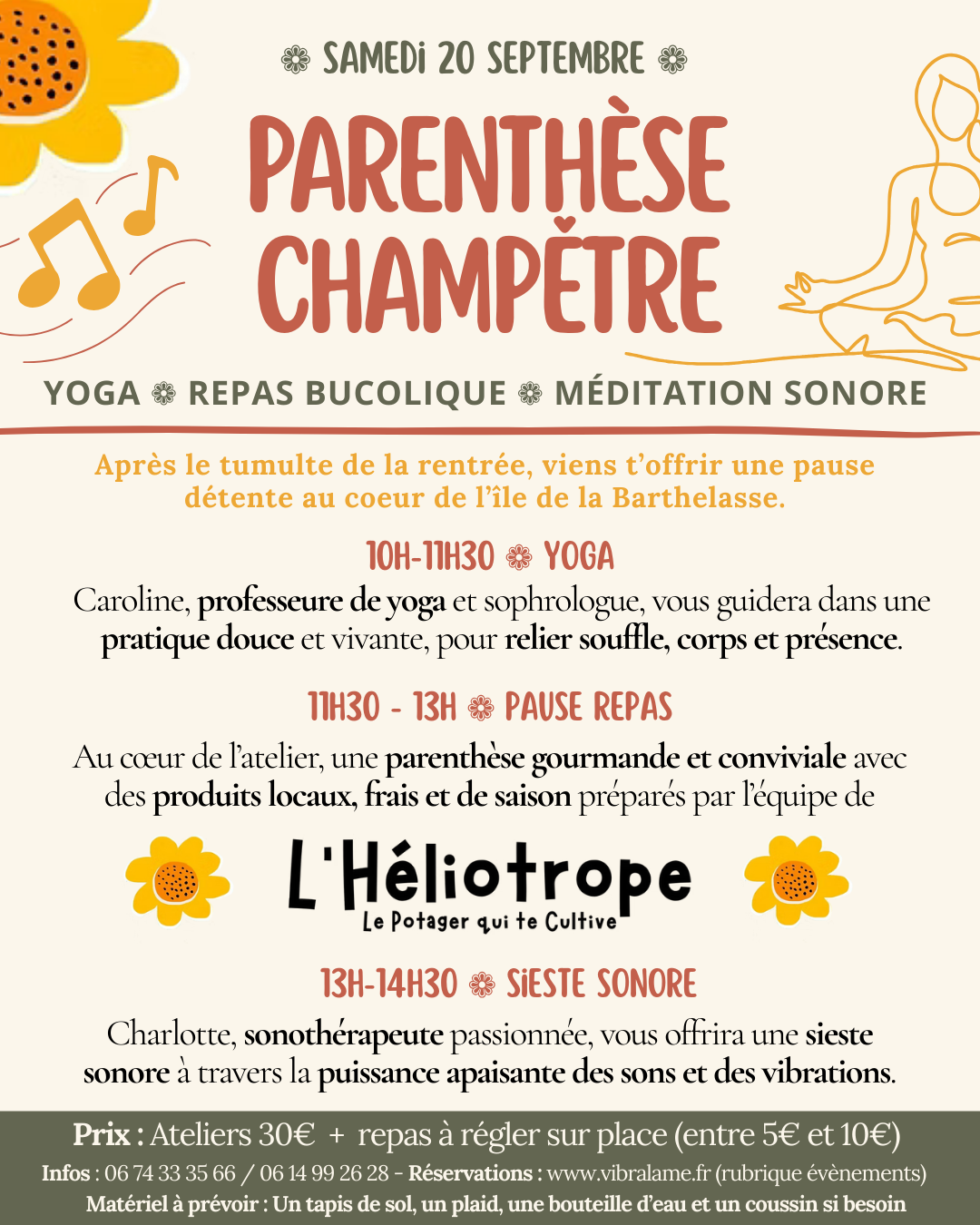 Après le tumulte de la rentrée, nous vous proposons avec Charlotte, sonothérapeute, une pause champêtre dans un lieu atypique, l’Héliotrope, sur l’île de la Barthelasse avec un programme pensé pour se détendre et prolonger un peu la douceur des beaux jours :
